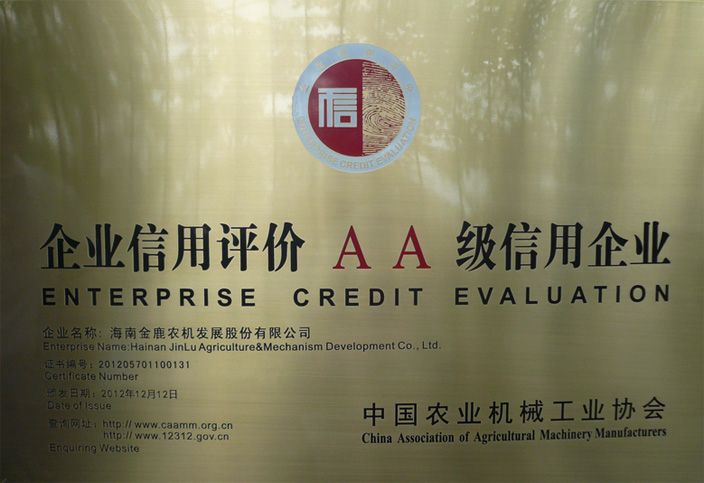 2012年12月12日,在山東青島召開的2012年全國農(nóng)機(jī)工業(yè)工作會(huì)議暨中國農(nóng)業(yè)機(jī)械工業(yè)協(xié)會(huì)五屆二次理事大會(huì)上,隆重表彰了全國67家農(nóng)機(jī)行業(yè)獲得A級以上企業(yè)信用等級的企業(yè),來自國家農(nóng)業(yè)部、工信部、農(nóng)機(jī)院、農(nóng)機(jī)協(xié)會(huì)等領(lǐng)導(dǎo)出席了授牌儀式,海南金鹿農(nóng)機(jī)發(fā)展股份有限公司在信用評價(jià)過程中榮獲AA級稱號。
