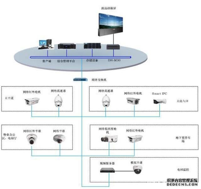 本系統(tǒng)采用大華智能小區(qū)綜合管理平臺,具備視頻監(jiān)控系統(tǒng)管理模塊,可通過網(wǎng)絡來管理網(wǎng)絡硬盤錄像機機(NVR),前端攝像機或編碼器。綜合管理平臺配備高性能嵌入式服務器,可支持大量高清攝像機實時顯示、云臺控制,錄像操作、回放等功能。